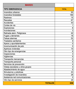 Respecto a la actividad de la red de parques de Bomberos del SEPA, hay que señalar que, durante el pasado mes de marzo, realizaron un total de 659 salidas a distintas intervenciones. La mayor parte, en concreto 180, fueron para incendios forestales. A éstas les siguieron los incendios urbanos con 93 salidas, los rescates con 67 salidas y los accidentes de tráfico con 43. También se realizaron 42 salidas para retirada de elementos peligrosos . (Ver cuadro adjunto)
